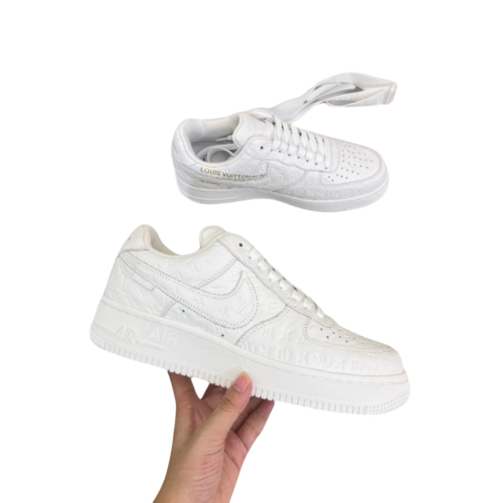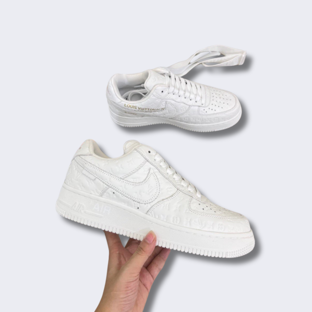 حذاء سنيكرز أبيض Nike بتصميم يجمع بين روح الشباب وأناقة العلامات الفاخرة، حيث يدمج بين البساطة الكلاسيكية لتصميم Air Force 1 ولمسة فخامة لويس فويتون.